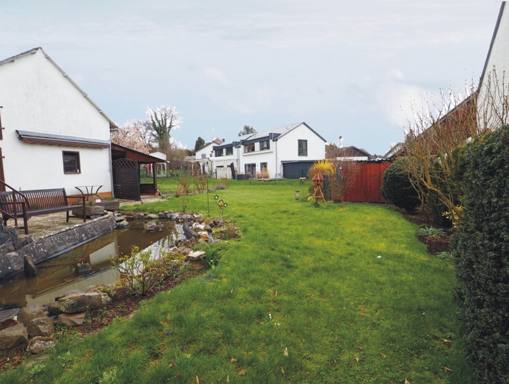 Ein kleiner Wintergarten, eine Terrasse sowie ein pflegeleicht angelegtes Grundstück mit Teich runden dieses Angebot ab.