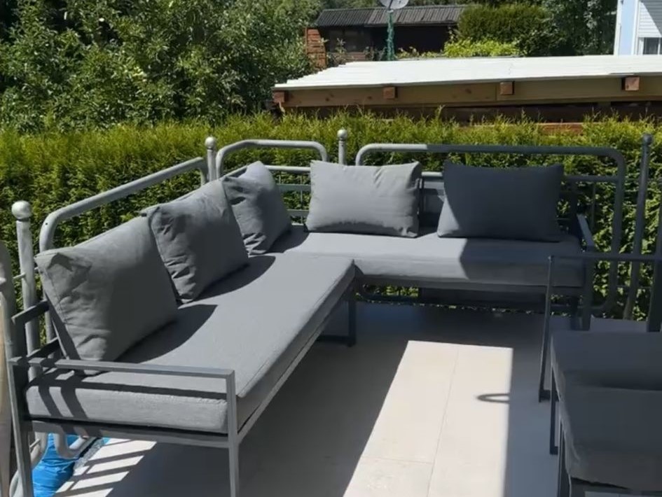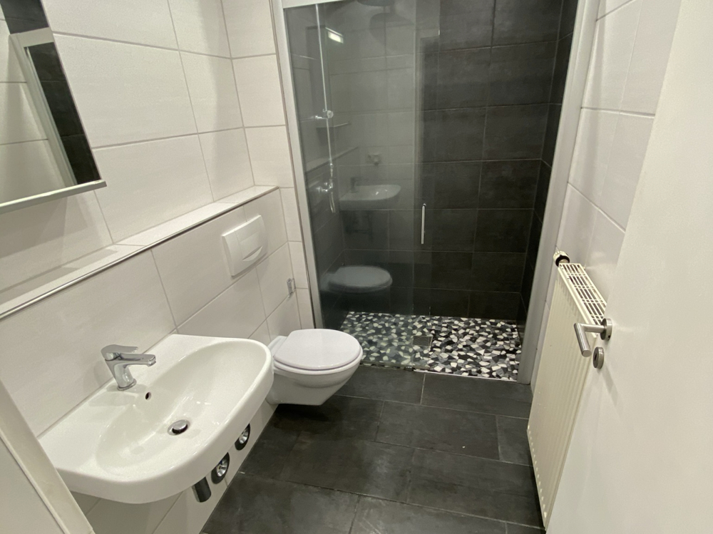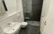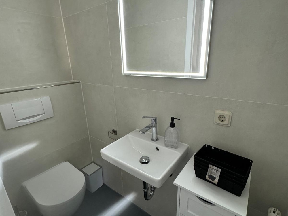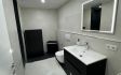 - Hochwertige Großformatfliesen in den Badezimmern / betongrau