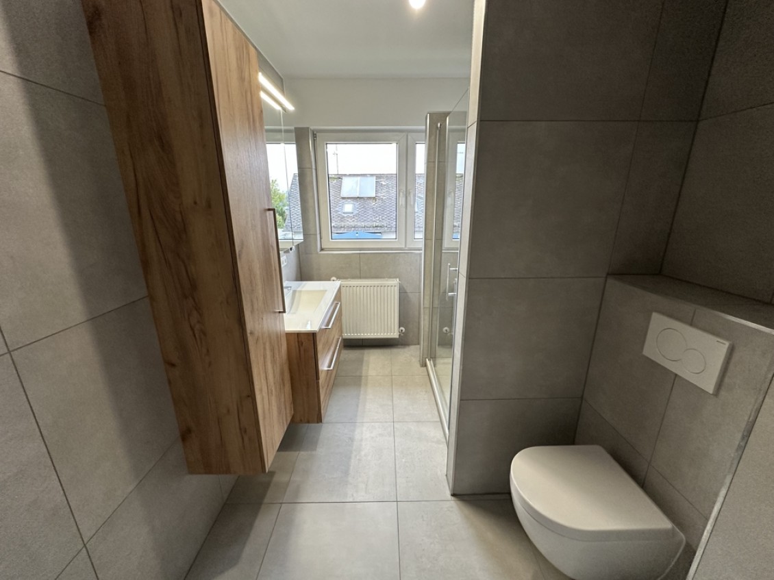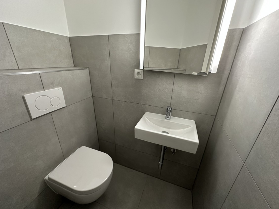 - Bodenbeläge aus Vinyl in Holzoptik und Großformatfliesen in Badezimmer und WC